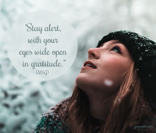 “Pray diligently. Stay alert, with your eyes wide open in gratitude.” (MSG)